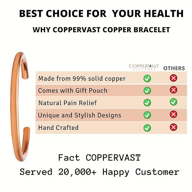 Copper is known to be an essential element in maintaining a healthy body. It acts as a brain stimulant and boosts immunity and energy. Helps in reducing symptoms of arthritis, it is believed that copper improves blood flow providing relief from arthritis, migraines, carpal tunnel and assists in the delivery of oxygen and nutrients to the body's tissues.