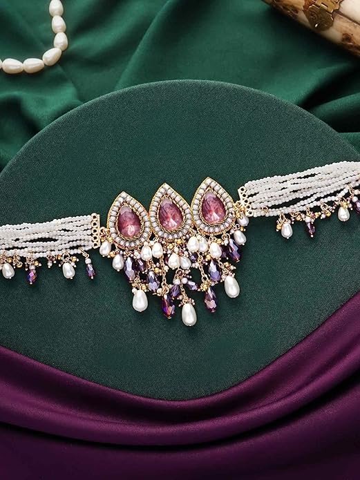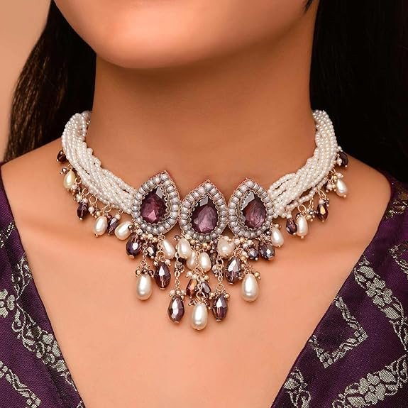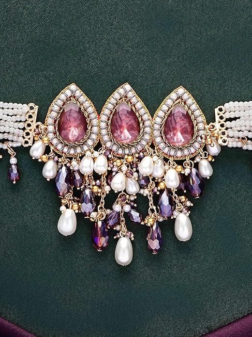 Add a touch of royal elegance to your look with this stunning Pearl & Lavender Teardrop Choker Necklace. Designed with multiple strands of delicate white seed pearls, this choker features three statement teardrop-shaped lavender stones at the center, beautifully framed with sparkling crystal detailing.