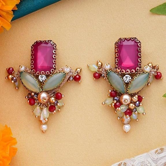 Make a bold style statement with these stunning Ruby Pink & Mint Floral Earrings. Designed with a rectangular ruby-pink stone stud at the top, these earrings feature intricate golden detailing that adds a royal touch.