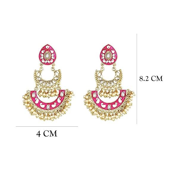These beautiful earrings feature an intricate hand-painted enamel design in vibrant hues, combined with shimmering stones and bead accents that create a dazzling, festive look. The classic Chandbali (crescent moon) shape adds a touch of heritage charm, making them perfect for weddings, festivals, cultural celebrations, parties, or any special occasion.