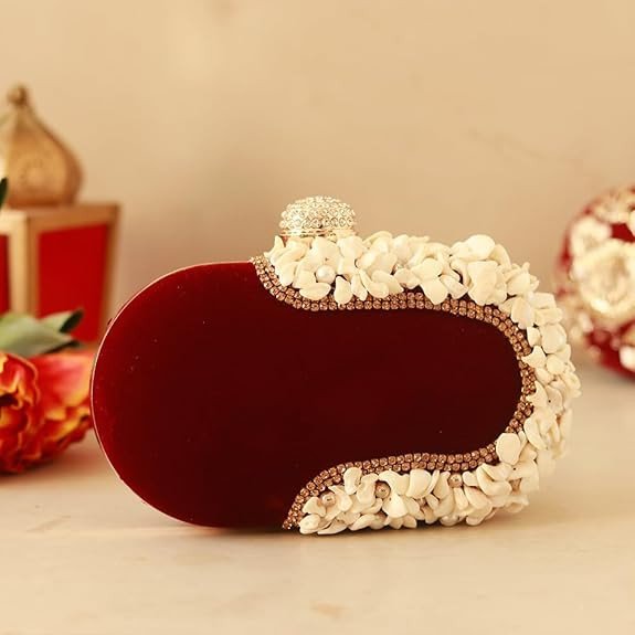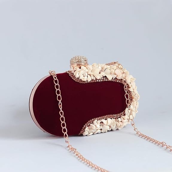 This elegant maroon velvet clutch is beautifully designed with delicate white floral embellishments, giving it a luxurious and classy look. It features a decorative stone-studded knob closure on the top that adds a royal touch. The clutch also comes with a golden chain strap, allowing you to carry it as a shoulder bag or stylish sling.
