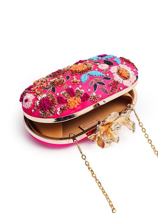 This stunning pink designer clutch features vibrant multicolor floral embroidery with intricate thread work, bead detailing, and sequin embellishments. The rich handcrafted floral patterns give it a bold and festive look, making it a perfect statement accessory.