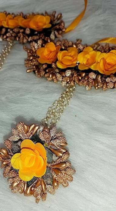 CIYA PLUS Beautiful Traditional Yellow And Golden Flower Jewellery Set For Mehandi/Haldi/Baby Shower . Light in weight & gives you a rich look. ,Free Size ,Weight less ,soft & easy to Handle .It is made of artificial flower & pearl mala. We are extremely happy to be serving thousands of customers across India and satisfying them with our unique designs that are not available anywhere else. Care – Please do not use water or chemicals clean it. Use dry cotton cloth to wipe the dust off. Wear these fancy earrings for women on ethnic occasions like marriage, wedding or traditional gathering with suit or Sari.
