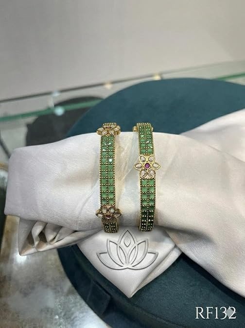 Enhance your traditional look with the elegance of the ROHINI NX Gold Plated Green Stone Bangles Set, designed to bring out timeless beauty and sophistication. These stunning kada-style bangles feature a luxurious gold-plated finish paired with finely arranged green stones that create a rich and eye-catching appeal. The highlight of this set is the delicate floral Kundan design, adding a royal touch inspired by classic Indian jewelry craftsmanship. Whether you are dressing up for a wedding, festival, or special occasion, these bangles perfectly complement ethnic outfits like sarees, lehengas, and salwar suits. Crafted for both style and comfort, the adjustable design ensures a snug fit without compromising on elegance. Lightweight yet durable, they are suitable for long wear during celebrations. Make every moment special or surprise your loved ones with this beautiful jewelry piece that blends tradition with modern convenience.
