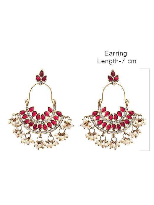 Make a bold ethnic statement with these stunning rani pink chandbali earrings. Designed with a delicate gold-tone hoop base, the earrings feature vibrant pink teardrop stones arranged in a graceful crescent pattern. The top is accented with a small floral cluster design, while the lower half is beautifully adorned with tiny pearl danglers that add elegant movement and festive charm.