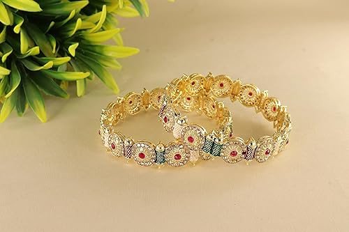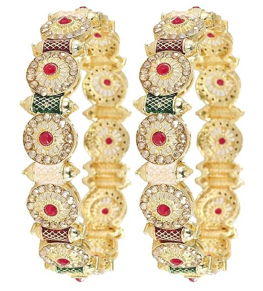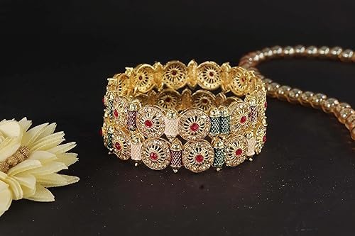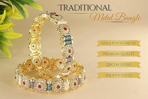 NMII's Traditional Gold Plated Alloy Metal Bangles Kada Set For Women & Girls. These Metal Bangles Set is Perfect to wear on Weddings, Party, Anniversary, Occasion, & Daily wear. It is Crafted from high-quality Metal Material & Zircon Diamond Stones. These are durable and features a vibrant color symbolizing love, passion, and new beginnings. The intricate design showcases NMII's skillful craftsmanship, ensuring you shine on your special day. The set also doubles as a versatile piece of bridal jewelry, complementing a wide range of outfits, including classic sarees and modern lehengas. NMII prides itself on offering the finest quality, timeless style, and unwavering commitment to tradition. The set is designed to make your day extra special, ensuring you look and feel your best. Elevate your bridal ensemble with NMII's Bangles Set and make memories that will last a lifetime. These NMII's Designer Bangles Set Have a Premium Finish and are Perfect for Weddings, Engagements, Functions, Festival, Rituals and Events. The Brand NMII sells all types of Glass Bangles, Metal Bangles, Acrylic Bangles, Chuda Sets, Kaleera Latkan Sets, Kadas, Bracelets, Women and Girls Traditional to Modern Jewellery, and many More. And Please Refer to our Size Chart to Know your Hand Size Precisely. To maintain longevity, clean bangles with a smooth cotton cloth, avoid direct water, perfume, deodorant, sunlight, and chemicals, and store them in an airtight zip-lock pouch. Thank You For Choosing NMII's Metal Bangles Collection. We are selling on Amazon Since 2016.