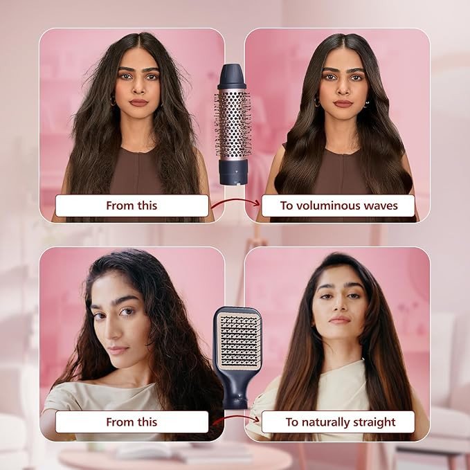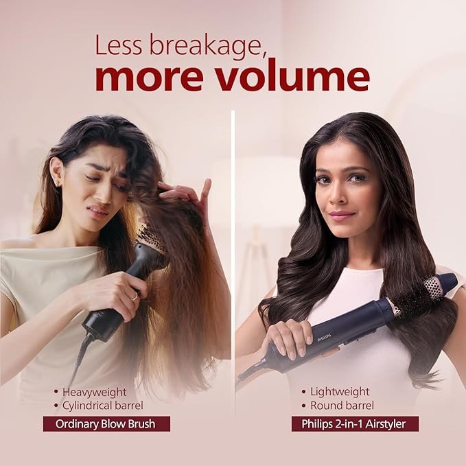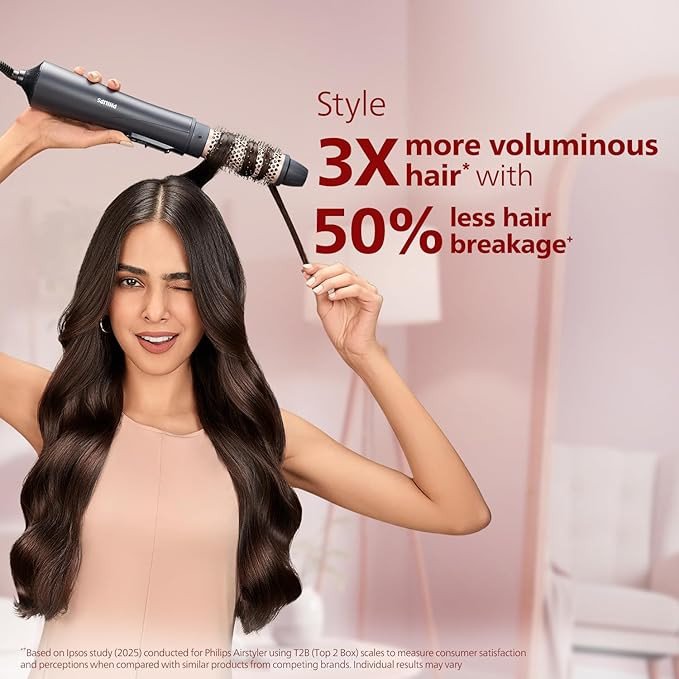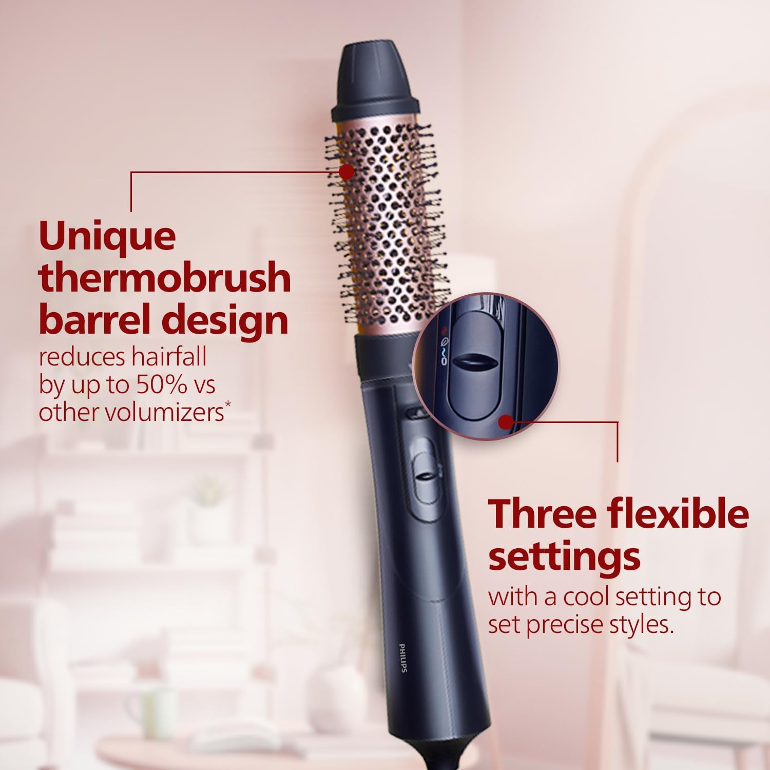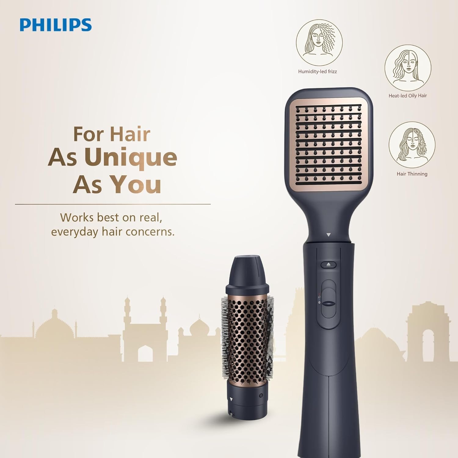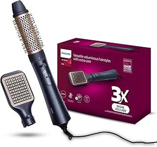 The Philips AirStyler is a hair volumizer with 2 different attachments for easy, daily hair styling. The AirStyler uses warm air that is evenly distributed across the brush, while the ionization function helps your hair shine more and also removes static build-up in the hair. The flexible heat and speed settings provide full control over your styling experience. Add more volume, create waves, straighten or define your hair in different styles with different attachments. When hair care is a top priority, the care setting ensures that your hair dries quickly but is protected from overheating with consistently strong airflow, but with a constant temperature for care. Styling the hair is quick and easy thanks to the ceramic plates with argan oil. Hair feels as silky smooth as it looks.