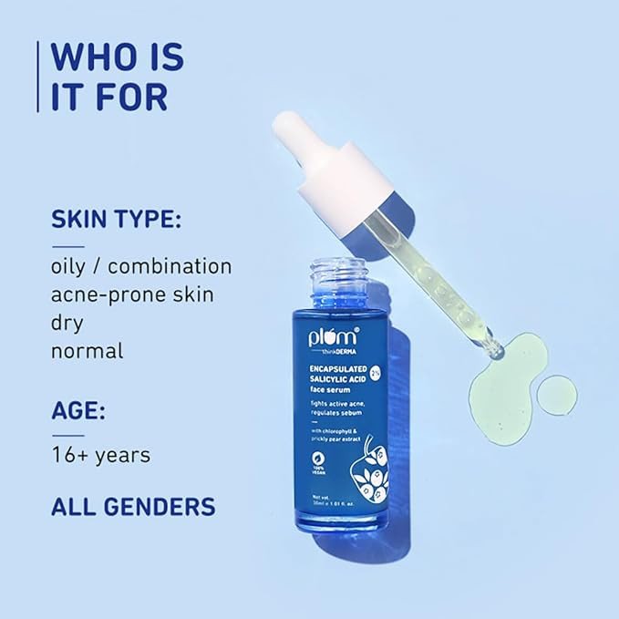 Plum 2% Encapsulated Salicylic Acid Serum is a light & non-greasy daily serum that fights active acne, controls oiliness on face, regulates sebum, brightens skin, and minimizes pores. Enriched with cholorophyll, prickly pear & blueberry extracts, it also reduces inflammation for a smoother, clearer skin.