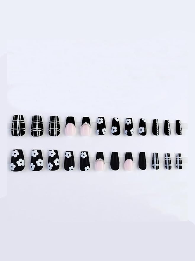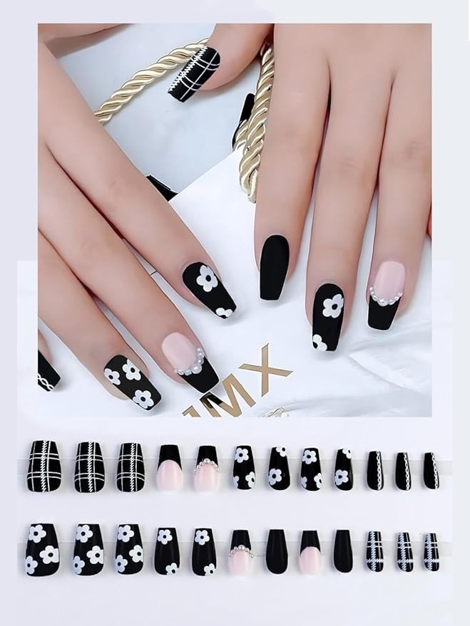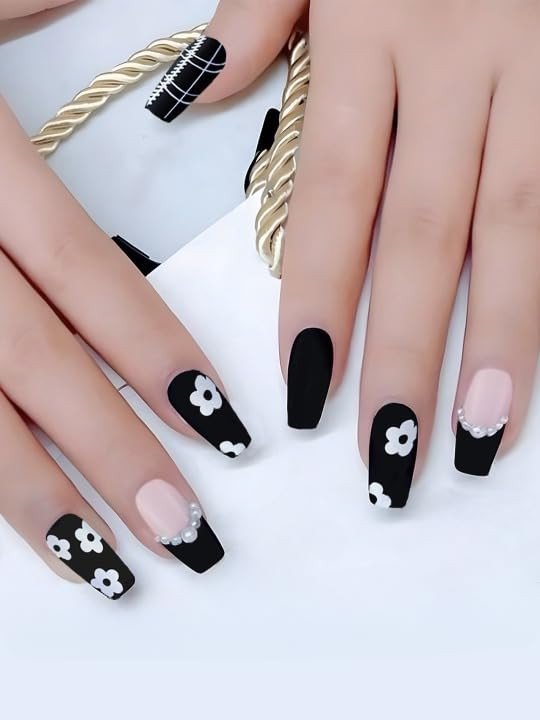 Upgrade your nail game with the luxurious Secret Lives Premium Matte Coffin Shape Press-On Nails. This stunning set features a bold combination of matte black and translucent pink nails, beautifully enhanced with delicate white floral designs and elegant pearl embellishments for a classy, high-end finish.