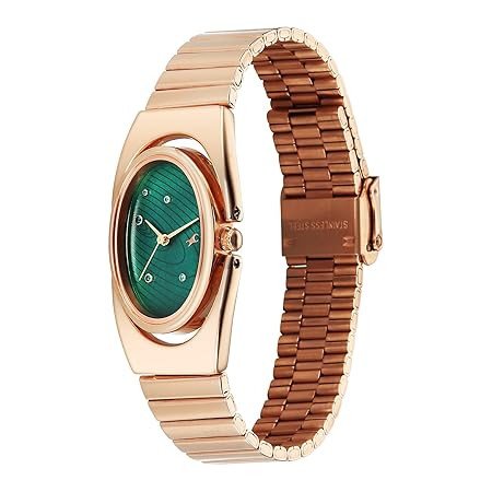 Upgrade your style with this premium Fastrack women’s watch featuring a unique oval-shaped rose gold case and a stunning emerald green textured dial. The elegant stainless steel strap in rose gold finish gives it a classy and modern look, perfect for office wear, parties, and special occasions.