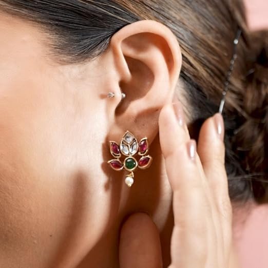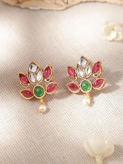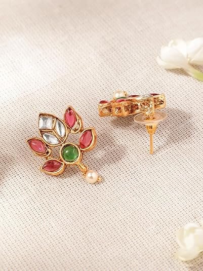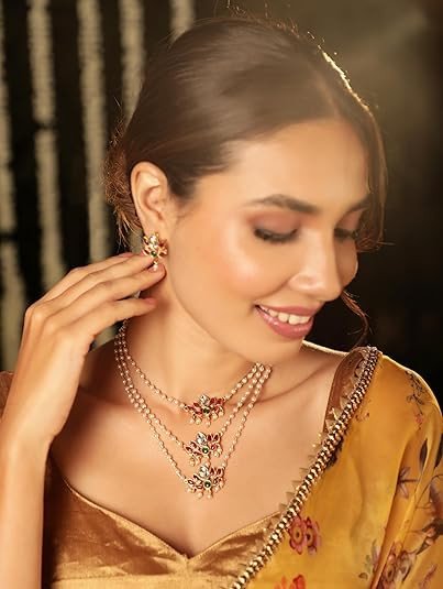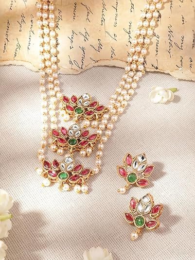 Rubans 22K Gold-Plated Necklace Set crafted with white Kundan, Cubic Zirconia & glossy pearl bead hangings, paired with jhumka earrings & maang tikka, perfect for weddings, parties & festive looks