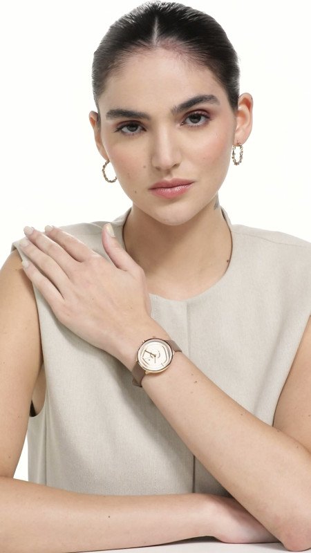 This elegant women’s analog watch features a minimal beige dial with a stylish geometric inner design and slim gold-tone hour markers. The gold-plated round case adds a premium and classy touch, while the soft brown leather strap provides comfort for all-day wear.