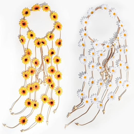 Sucrain 2pcs Floral Headband Summer Sunflower Headdress Hair Accessories Wreath Bridal Headband Bohemian Beads Adjustable Headpiece for Women Girls Photo Prop (Yellow White)