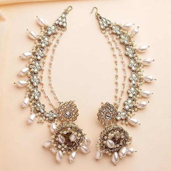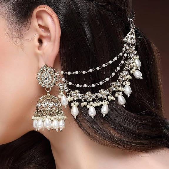 These stunning jhumkas feature white kundan stones set in a rich gold-plated finish, complemented by delicate pearl bead detailing that adds timeless charm. The highlight of this design is the multi-layered ear chain, which gives a regal and sophisticated look while providing better support and comfort.