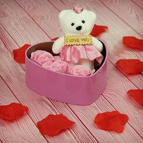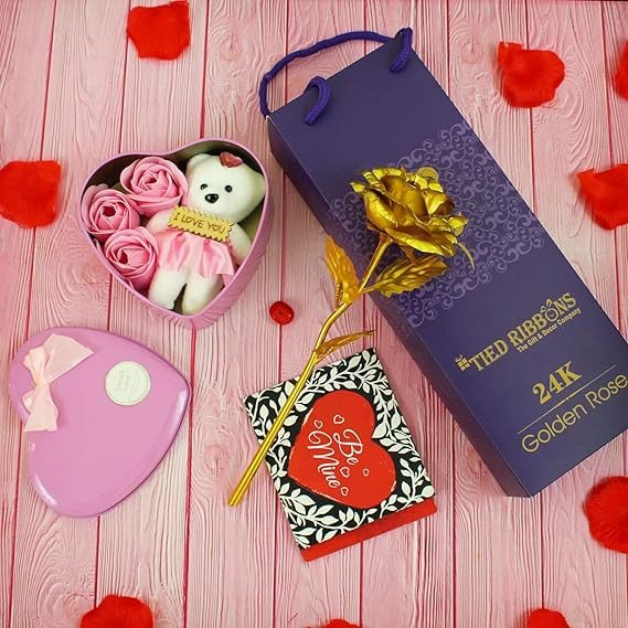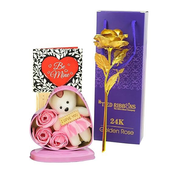 This romantic gift set by Tied Ribbons features a stunning 24K golden artificial rose paired with an adorable teddy bear arranged inside a heart-shaped box. The teddy holds a cute “I Love You” tag and is surrounded by soft pink foam roses, making it a perfect expression of love. The elegant purple gift box packaging adds a premium touch, ideal for Valentine’s Day, anniversaries, birthdays, or special surprises.