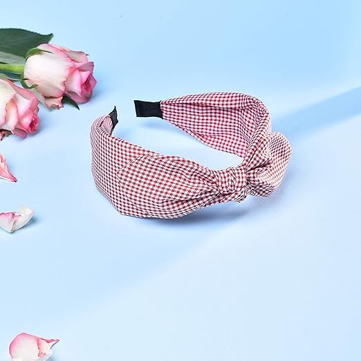 Vogue Hair Accessories Printed Fabric Knot Metal Hairband Headband for Women and Girls (Red_Check_Bow)