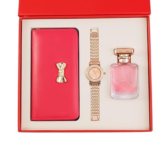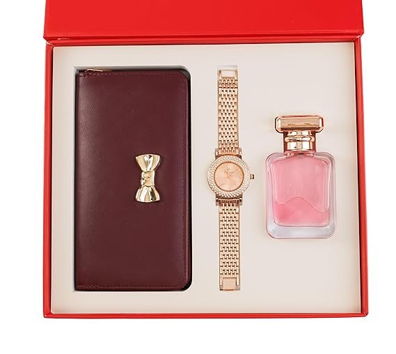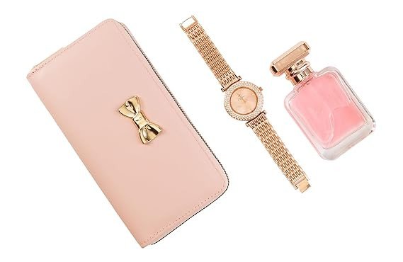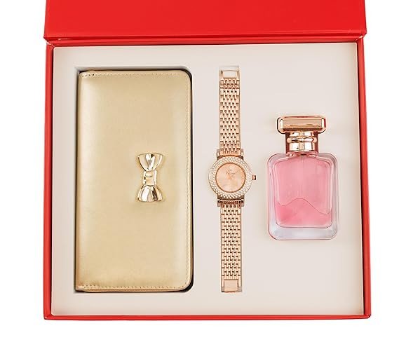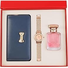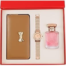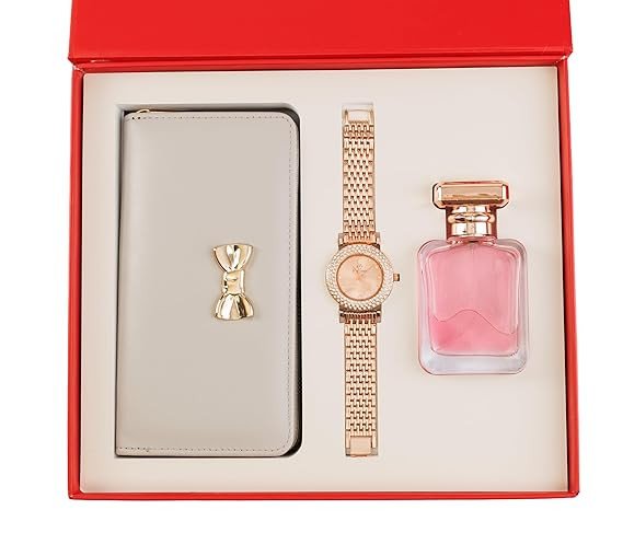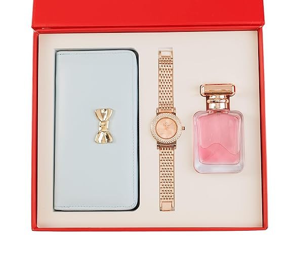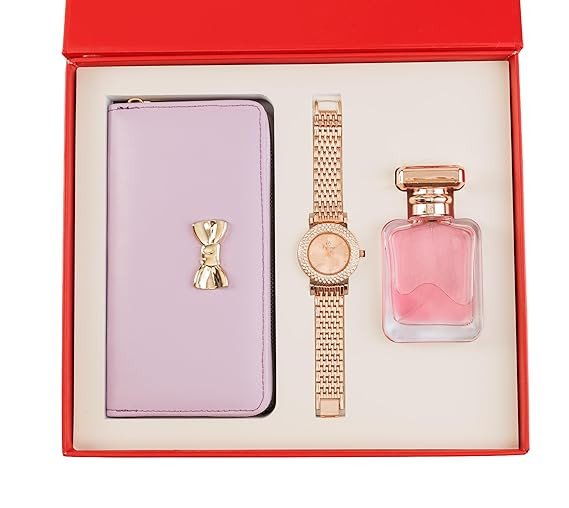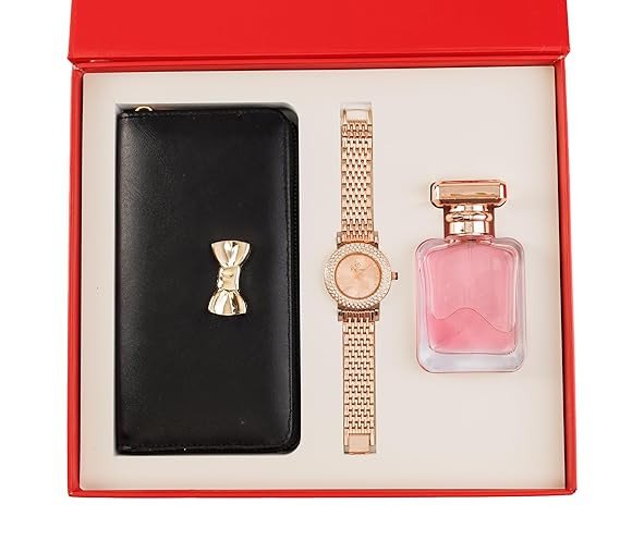 Yeh stylish 3-in-1 women’s gift set ek perfect luxury combo hai jo elegance aur utility dono ka perfect balance deta hai. Is set mein ek classy light pink wallet, ek beautiful rose gold metal strap watch aur ek attractive pink perfume bottle shamil hai.