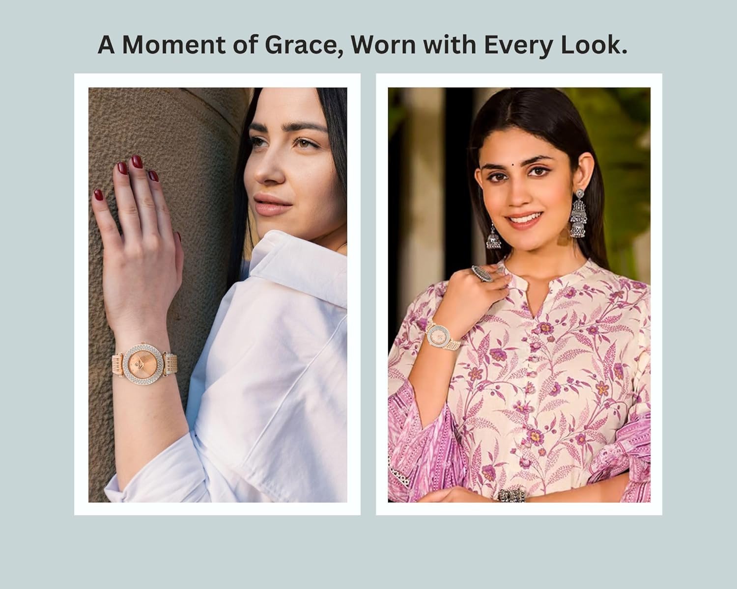 • Rose Gold Watch: Shiny metal strap aur classy dial ke saath, party aur casual dono looks ke liye perfect.