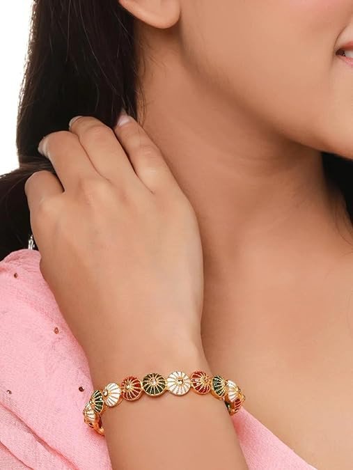 Discover the timeless allure of traditional Indian artistry with this exquisite three-piece jewellery set. The collection features intricately crafted gold-plated bangles and bracelets, masterfully adorned with vibrant meenakari work showcasing stunning peacock motifs. Each piece demonstrates superior craftsmanship with delicate scroll work patterns and a mesmerising interplay of red, green, and blue enamel against the lustrous golden base. The lightweight yet durable set and includes matching bangles with detailed peacock designs and complementary meenakari bracelets featuring beautiful circular patterns. Secure push-button box clasps ensure comfortable wear, while the versatile design allows pieces to be worn together or separately. Crafted from gold-plated brass with meticulous enamel work, this set perfectly complements both traditional Indian attire and contemporary fusion wear. Whether adorning yourself for a wedding, festival, or traditional celebration, these ornaments make a sophisticated statement while honouring centuries-old artistic traditions. Jewar Mandi Bangle Set Traditional Indian Peacock Design Multicolor Handmade Enamel Work Meenakari Bracelets Gold-Plated 2 Piece Kada Ad Cz Multi-Stones Jewelry