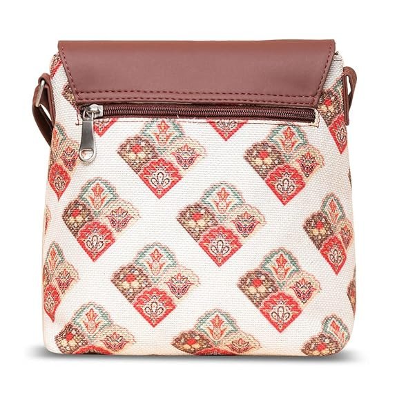 Add timeless elegance to your accessory collection with this beautifully designed Zouk sling bag. Featuring a soft beige base with delicate traditional motifs in red and green tones, this bag perfectly blends ethnic charm with modern minimal style. The smooth brown vegan leather flap and matching adjustable strap give it a premium and polished finish.