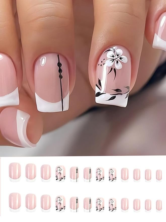 Achieve a classy and elegant look instantly with the Secret Lives Acrylic Reusable French Press-On Nails. Designed with a timeless French tip base, these nails are beautifully enhanced with delicate white floral patterns and stylish black leaf detailing for a modern artistic touch.