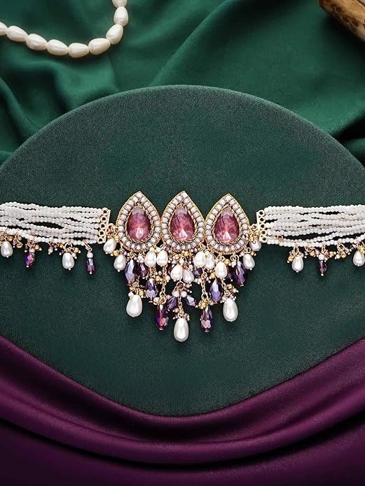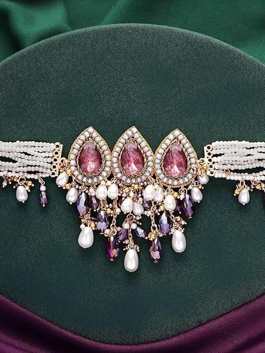 Add a touch of royal elegance to your look with this stunning Pearl & Lavender Teardrop Choker Necklace. Designed with multiple strands of delicate white seed pearls, this choker features three statement teardrop-shaped lavender stones at the center, beautifully framed with sparkling crystal detailing.