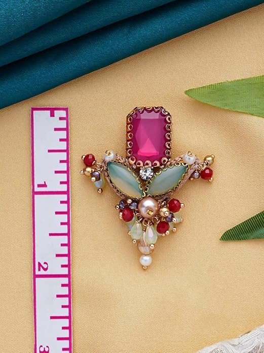 The lower portion is beautifully crafted with mint green petal-shaped stones, delicate pearl accents, and small red crystal beads for a vibrant and festive look. A cluster of pearls and stones at the base adds graceful movement and elegance.