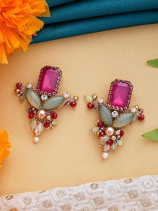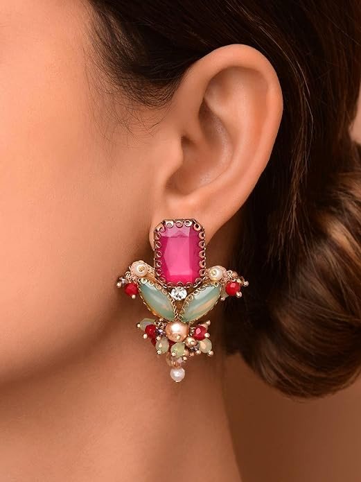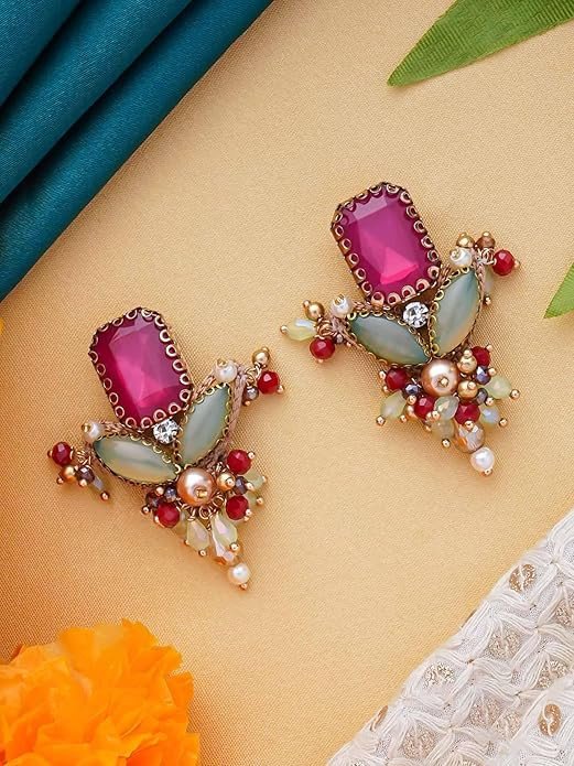 Make a bold style statement with these stunning Ruby Pink & Mint Floral Earrings. Designed with a rectangular ruby-pink stone stud at the top, these earrings feature intricate golden detailing that adds a royal touch.