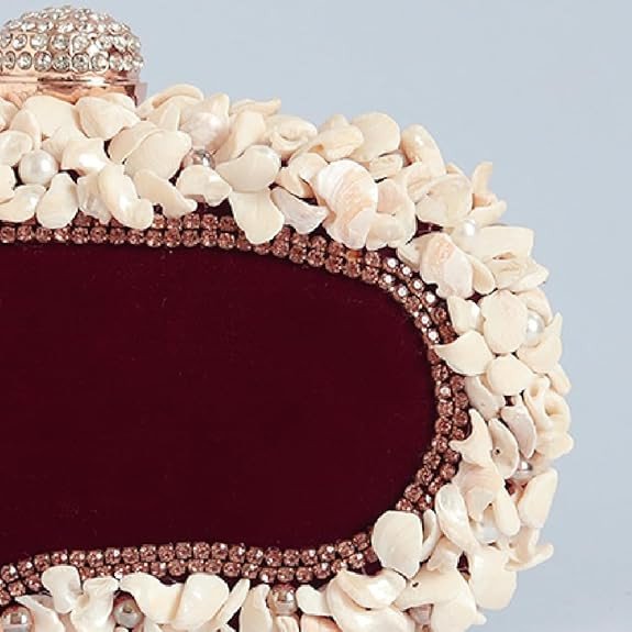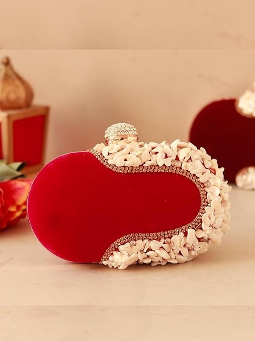 This elegant maroon velvet clutch is beautifully designed with delicate white floral embellishments, giving it a luxurious and classy look. It features a decorative stone-studded knob closure on the top that adds a royal touch. The clutch also comes with a golden chain strap, allowing you to carry it as a shoulder bag or stylish sling.