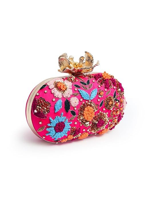 This stunning pink designer clutch features vibrant multicolor floral embroidery with intricate thread work, bead detailing, and sequin embellishments. The rich handcrafted floral patterns give it a bold and festive look, making it a perfect statement accessory.