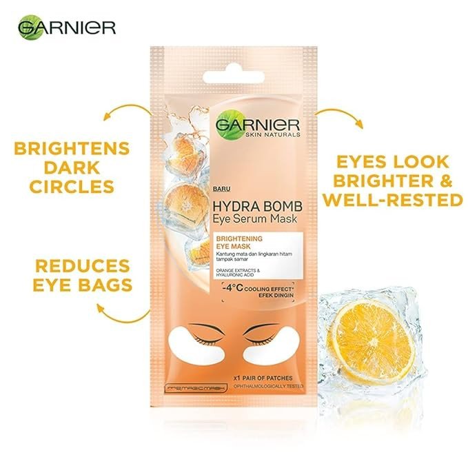 The Garnier Hydra Bomb Eye Serum Mask - Orange helps reduce eye bags and dark circles to give you awake, fresh, brighter-looking eyes! For tired and dull eye contours, this tissue mask is enriched with orange juice and hyaluronic acid, which will leave the eye area looking brighter, more refreshed, and more awake. It intensely hydrates and reduces the appearance of eye bags. The eye area will feel refreshed and revitalized, leaving a cooling effect on your skin.