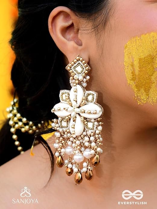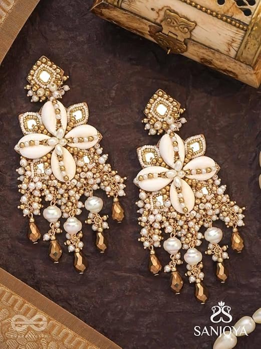 Elevate your festive and bridal look with these Royal Floral Pearl & Crystal Dangler Earrings. Designed with a beautiful floral motif at the center, the earrings feature petal-shaped ivory stones accented with delicate golden bead detailing.