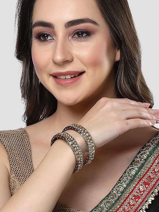 Karatcart Set of 2 Golden Kundan Studded Antique Gold Plated Bangles for Women