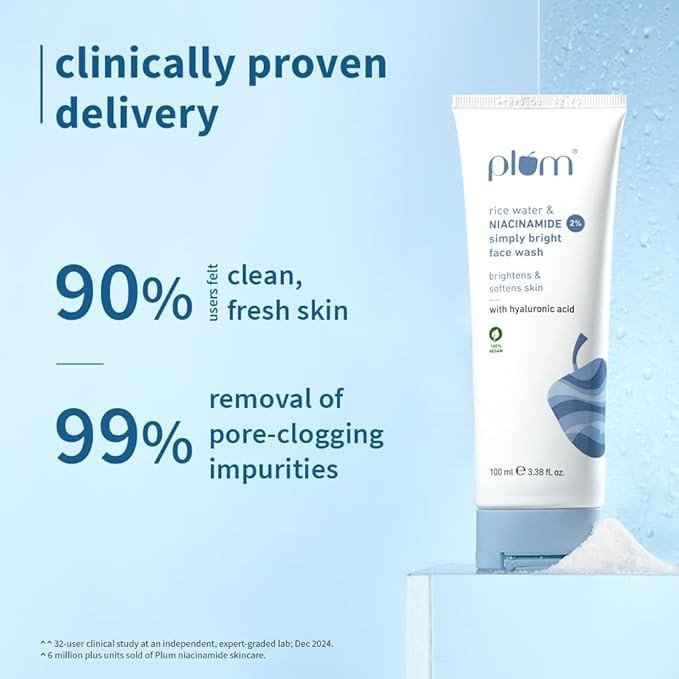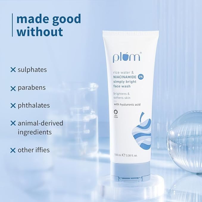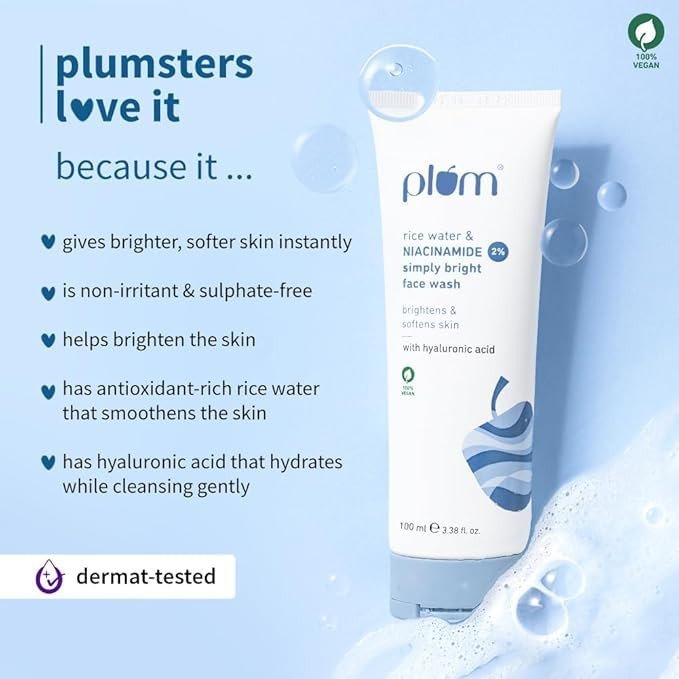 Step into the bright side with Plum 2% Niacinamide & Rice Water Simply Bright Face Wash! The dynamic duo of 2% Niacinamide and Rice Water work diligently to brighten, clear and smoothen your skin. Its gentle, non-drying and sulphate-free formula ensures your skin stays soft and supple after every wash.