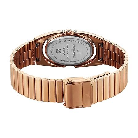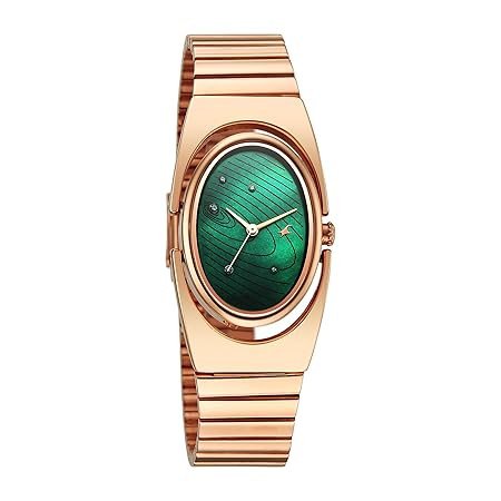 Upgrade your style with this premium Fastrack women’s watch featuring a unique oval-shaped rose gold case and a stunning emerald green textured dial. The elegant stainless steel strap in rose gold finish gives it a classy and modern look, perfect for office wear, parties, and special occasions.