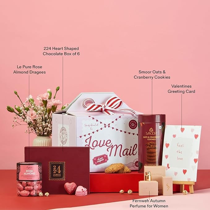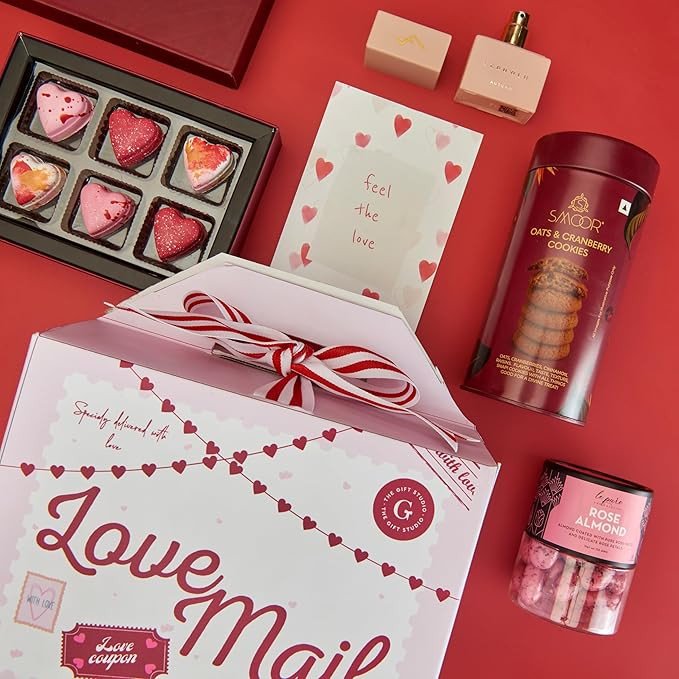 Inside this delightful box, you’ll find a mix of gourmet treats and sensory delights — from rich chocolates and crunchy cookies to fragrant perfume and delectable rose-flavored almonds. Each element is chosen to create a joyful unboxing experience that celebrates love, affection and thoughtful care.