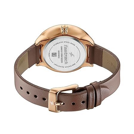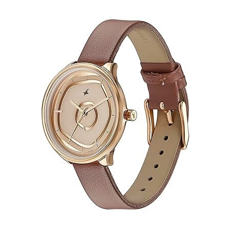 This elegant women’s analog watch features a minimal beige dial with a stylish geometric inner design and slim gold-tone hour markers. The gold-plated round case adds a premium and classy touch, while the soft brown leather strap provides comfort for all-day wear.