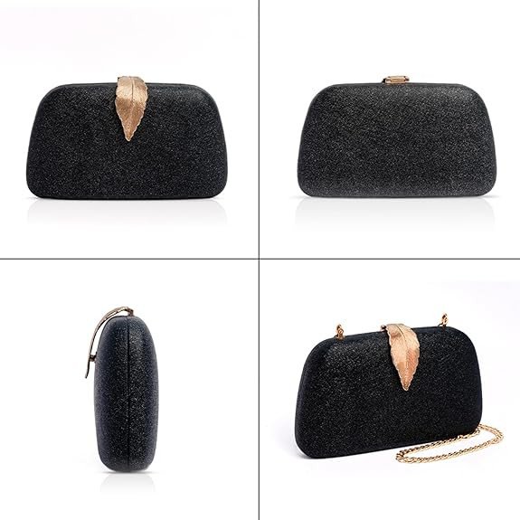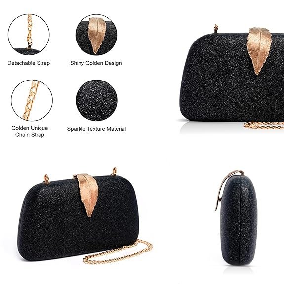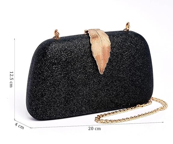 Make a bold style statement with this stunning black glitter clutch, designed to add instant glamour to your evening look. The sparkling textured surface gives it a luxurious shine, while the beautifully crafted gold leaf-shaped clasp adds a unique and elegant touch.
