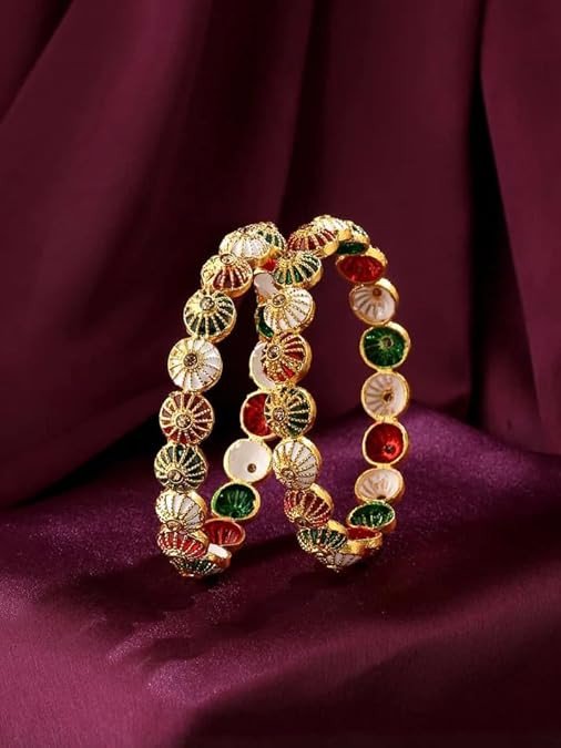Discover the timeless allure of traditional Indian artistry with this exquisite three-piece jewellery set. The collection features intricately crafted gold-plated bangles and bracelets, masterfully adorned with vibrant meenakari work showcasing stunning peacock motifs. Each piece demonstrates superior craftsmanship with delicate scroll work patterns and a mesmerising interplay of red, green, and blue enamel against the lustrous golden base. The lightweight yet durable set and includes matching bangles with detailed peacock designs and complementary meenakari bracelets featuring beautiful circular patterns. Secure push-button box clasps ensure comfortable wear, while the versatile design allows pieces to be worn together or separately. Crafted from gold-plated brass with meticulous enamel work, this set perfectly complements both traditional Indian attire and contemporary fusion wear. Whether adorning yourself for a wedding, festival, or traditional celebration, these ornaments make a sophisticated statement while honouring centuries-old artistic traditions. Jewar Mandi Bangle Set Traditional Indian Peacock Design Multicolor Handmade Enamel Work Meenakari Bracelets Gold-Plated 2 Piece Kada Ad Cz Multi-Stones Jewelry