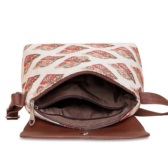 Add timeless elegance to your accessory collection with this beautifully designed Zouk sling bag. Featuring a soft beige base with delicate traditional motifs in red and green tones, this bag perfectly blends ethnic charm with modern minimal style. The smooth brown vegan leather flap and matching adjustable strap give it a premium and polished finish.